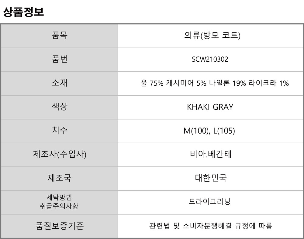 겉감 혼용 : 울 75% 캐시미어 5% 나일론 19% 라이크라 1%